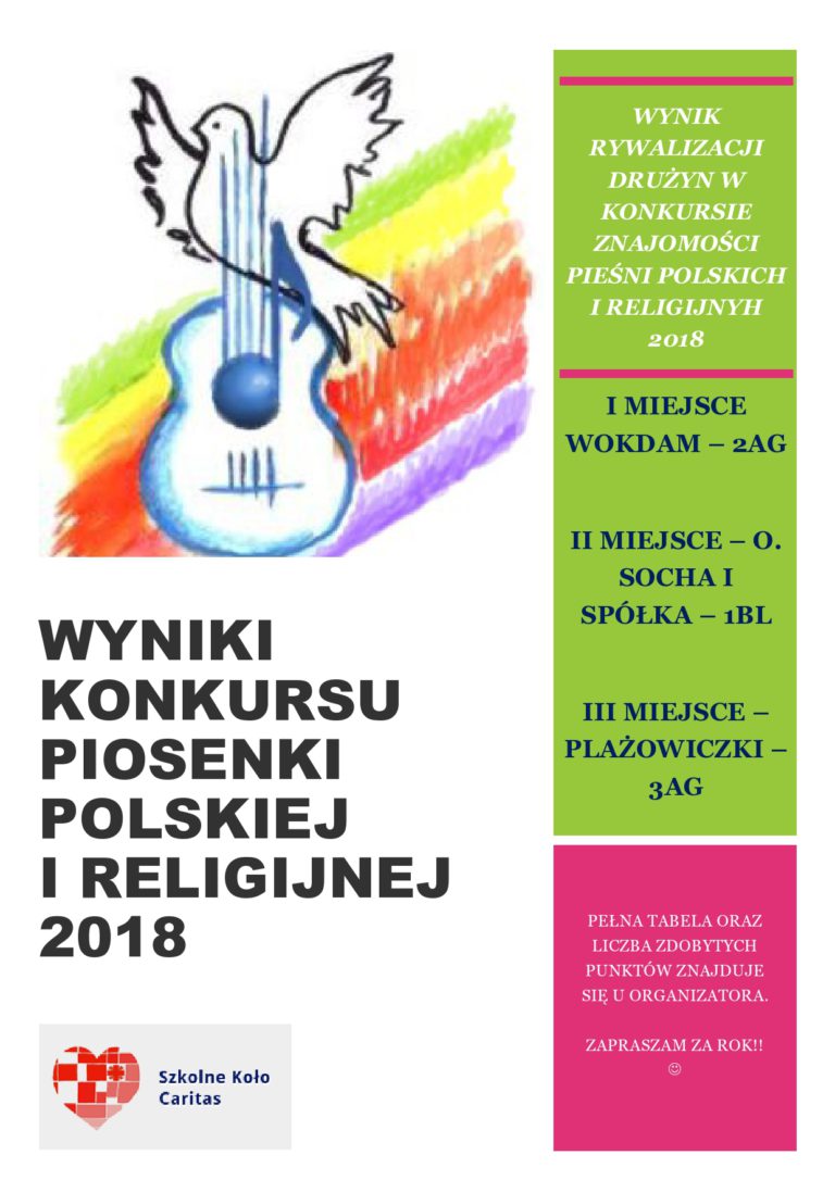 Przedstawiamy wyniki konkursu znajomości pieśni polskiej i religijnej 2018, który odbył się 30 maja 2018r i został zorganizowany przez Szkolne Koło Caritas W konkursie brało udział 6 zespołów. I MIEJSCE – 2G II MIEJSCE – 1BL III MIEJSCE – 3AG…