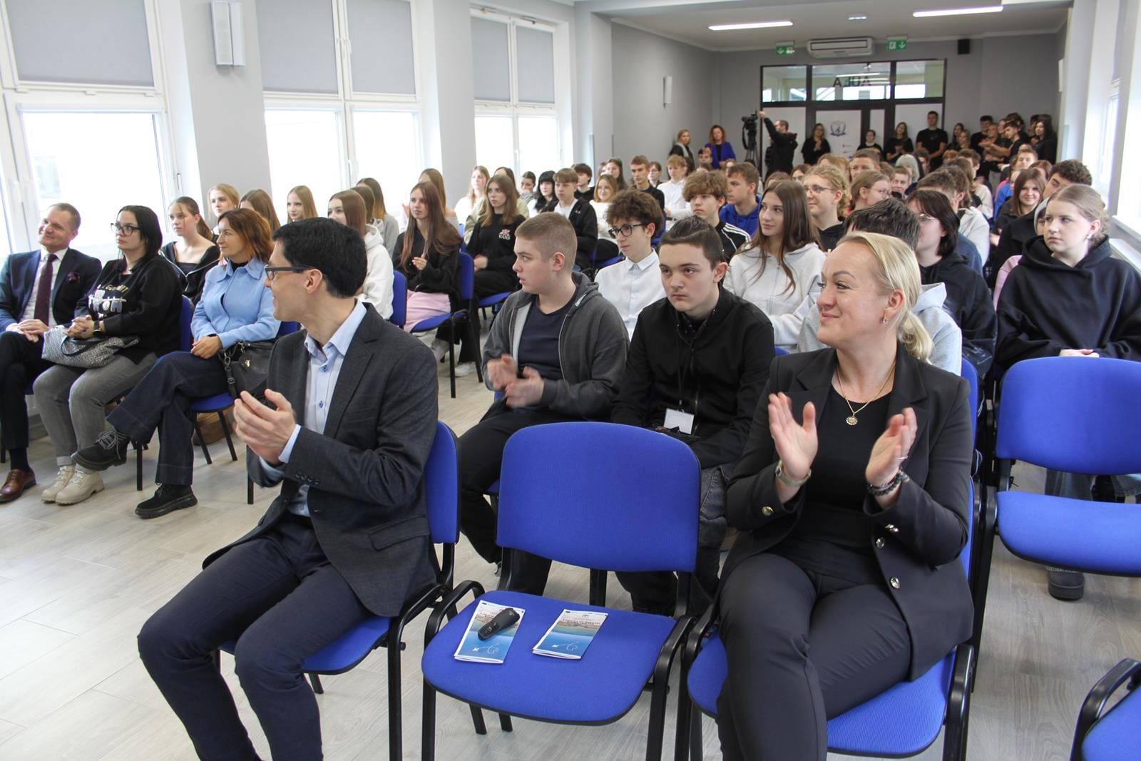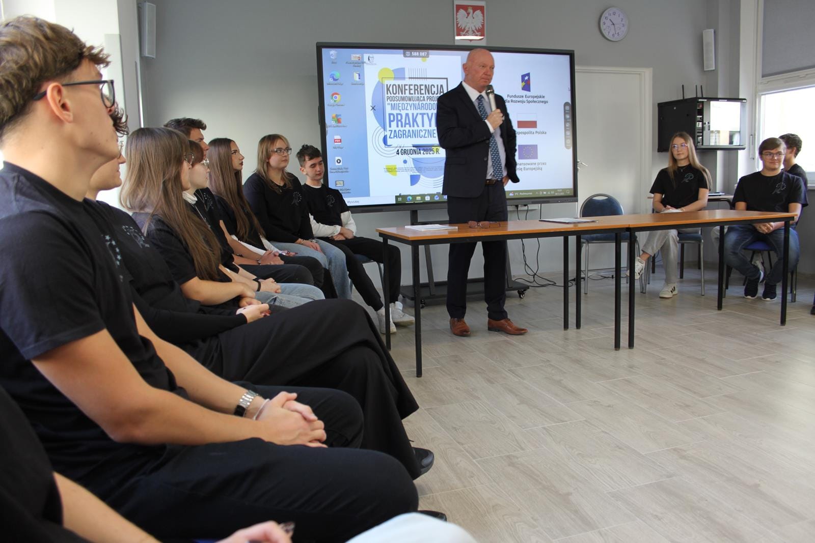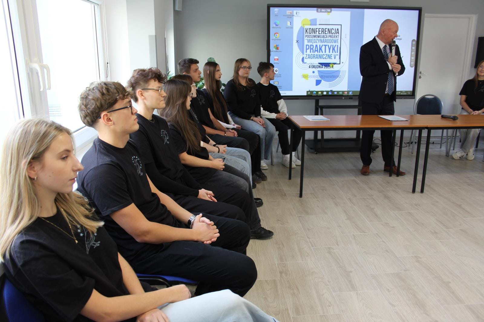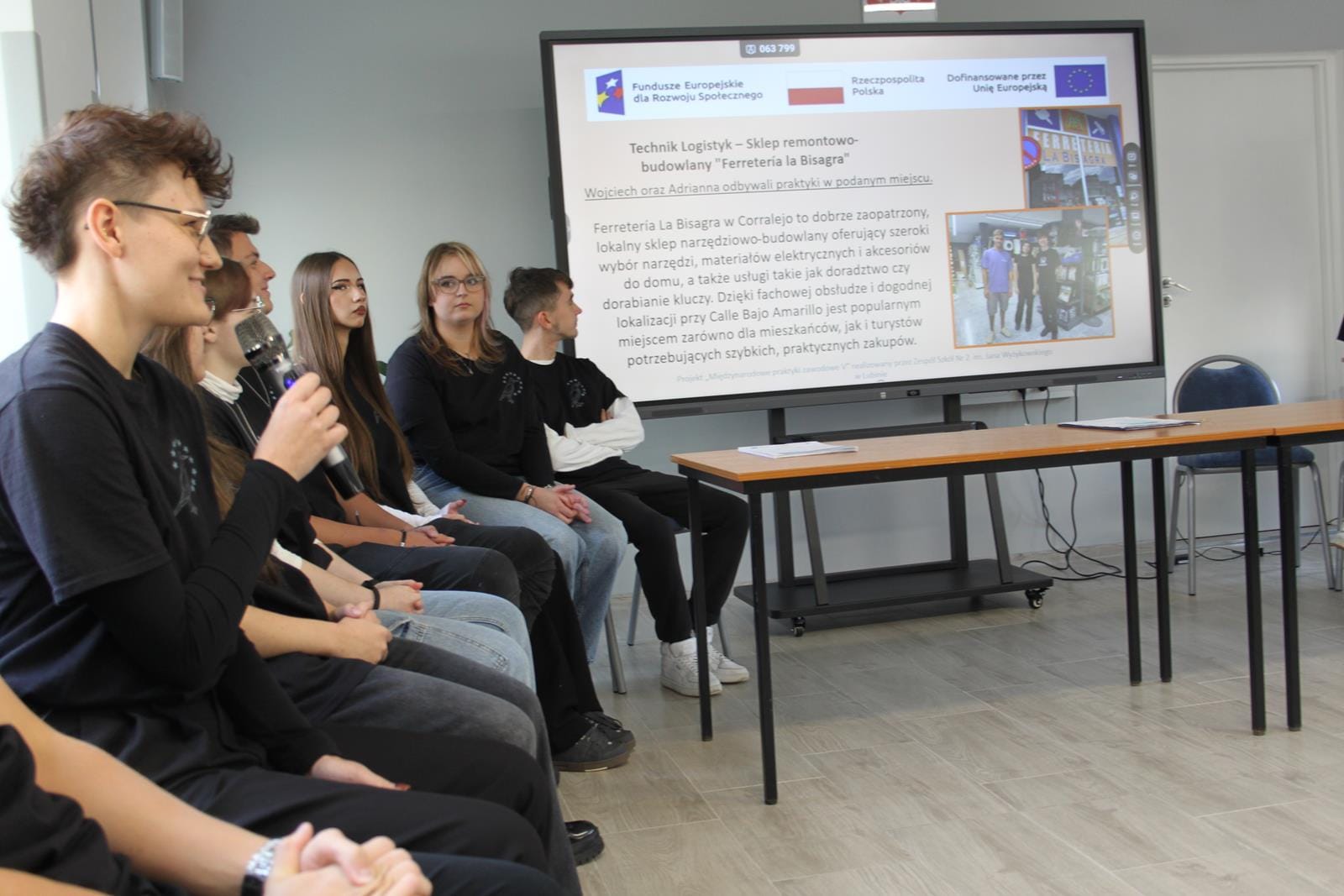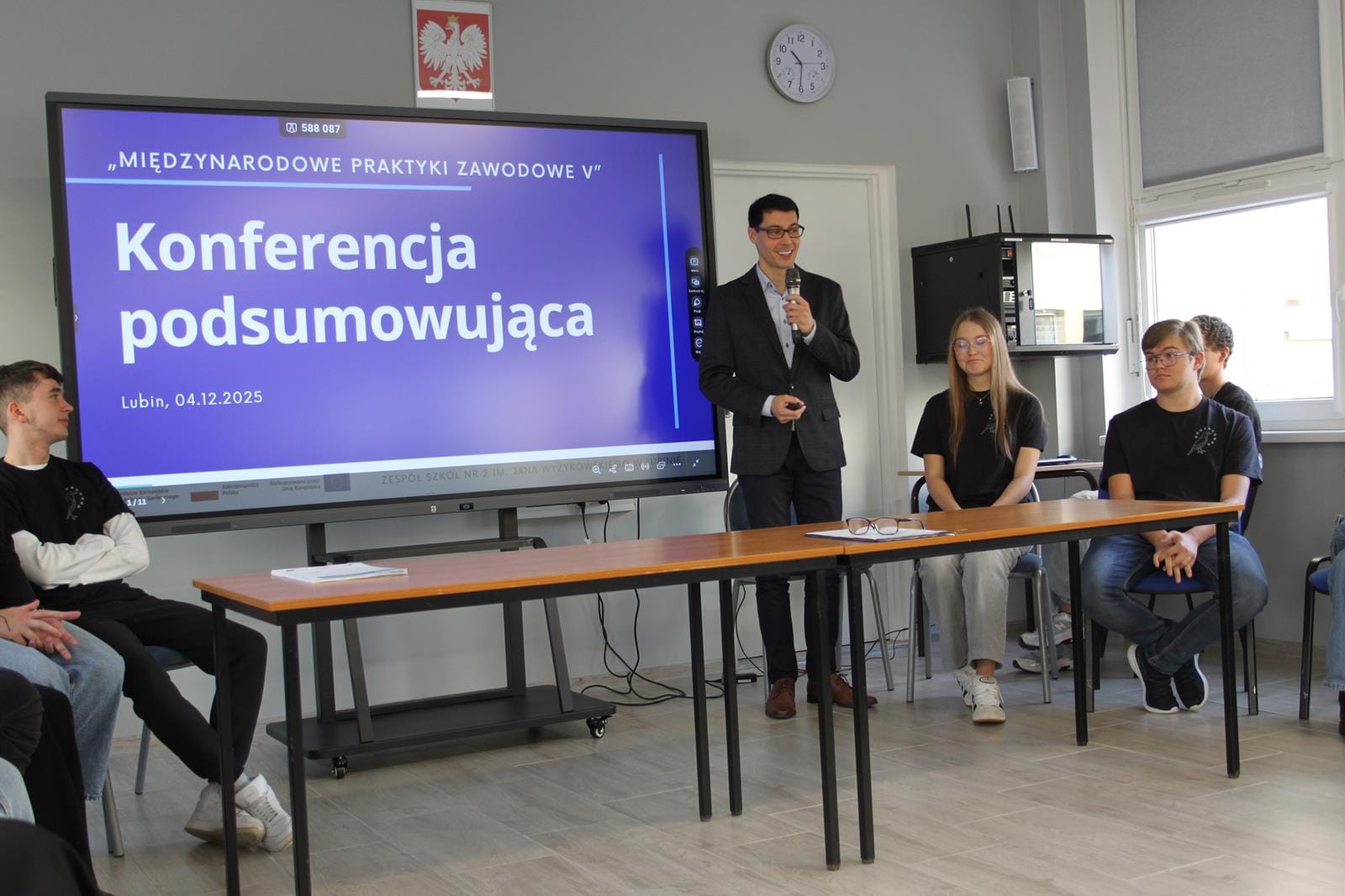 4 grudnia w Zespole Szkół nr 2 w Lubinie odbyła się konferencja podsumowująca i upowszechniająca efekty projektu współfinansowanego przez Unię Europejską ze środków Europejskiego Funduszu Społecznego – Międzynarodowe Praktyki Zawodowe V. W ramach tego projektu 18 uczniów naszego technikum odbyło miesięczne praktyki zawodowe na hiszpańskiej wyspie Fuerteventura realizując poszczególne zadania u zagranicznych pracodawców. Głównym celem projektu było zwiększenie konkurencyjności absolwentów technikum na rynku pracy, podniesienie kompetencji zawodowych, rozwijanie umiejętności językowych, zwłaszcza w zakresie języka angielskiego zawodowego, ale także języka hiszpańskiego, wykształcenie odpowiednich postaw, takich jak potrzeba kształcenia się przez całe życie i ciągłego podnoszenia kwalifikacji zawodowych, otwartość na inne kultury, wzmocnienie samooceny i poczucia własnej wartości, rozwijanie kompetencji miękkich, takich jak umiejętność pracy w grupie, odpowiedzialność, samodzielność, kreatywność, umiejętność pracy pod presją czasu i zarządzania sobą w czasie czy umiejętność radzenia sobie ze stresem. W konferencji oprócz praktykantów uczestniczyli koordynatorzy projektu: p. Marek Prokopowicz, Joanna Stembalska oraz opiekunowie: Inga Kruk, Ewelina Mazurek i Magdalena Krzyżanowska. Gościliśmy także uczniów szkół podstawowych : SP 8, SP 12, SP 9, SP 3 oraz potencjalnych kandydatów do kolejnych edycji programu z naszej szkoły czyli z Technikum nr 2 w Lubinie. Spotkanie poprowadził dyrektor szkoły pan Artur Pastuch.