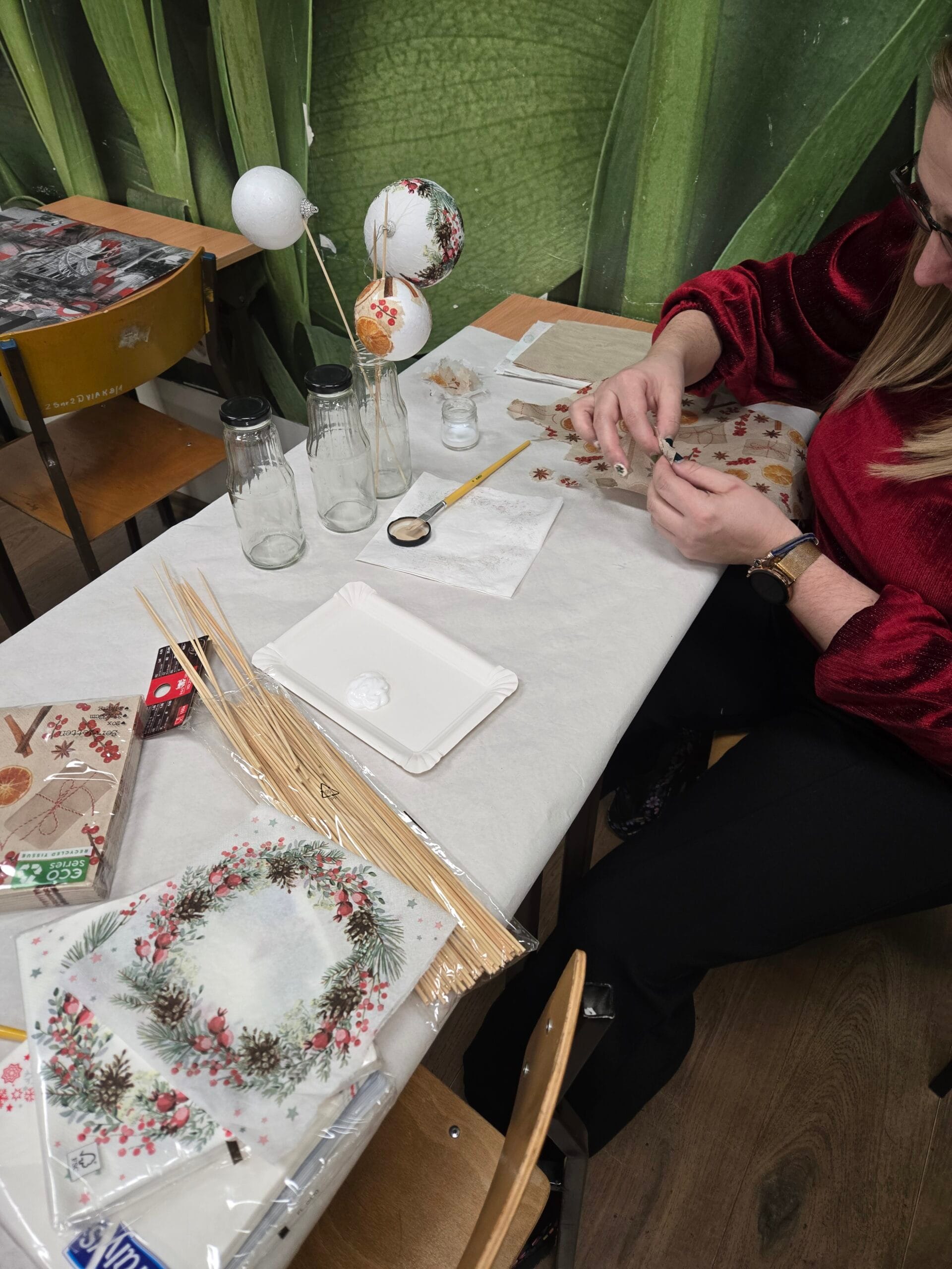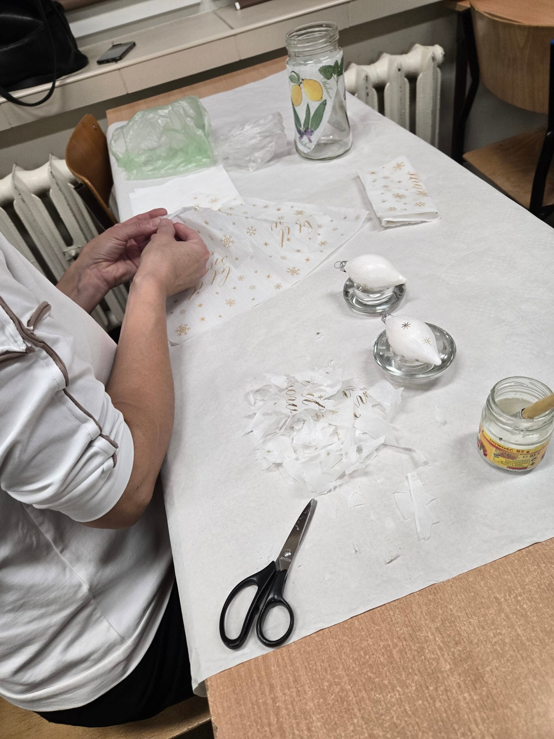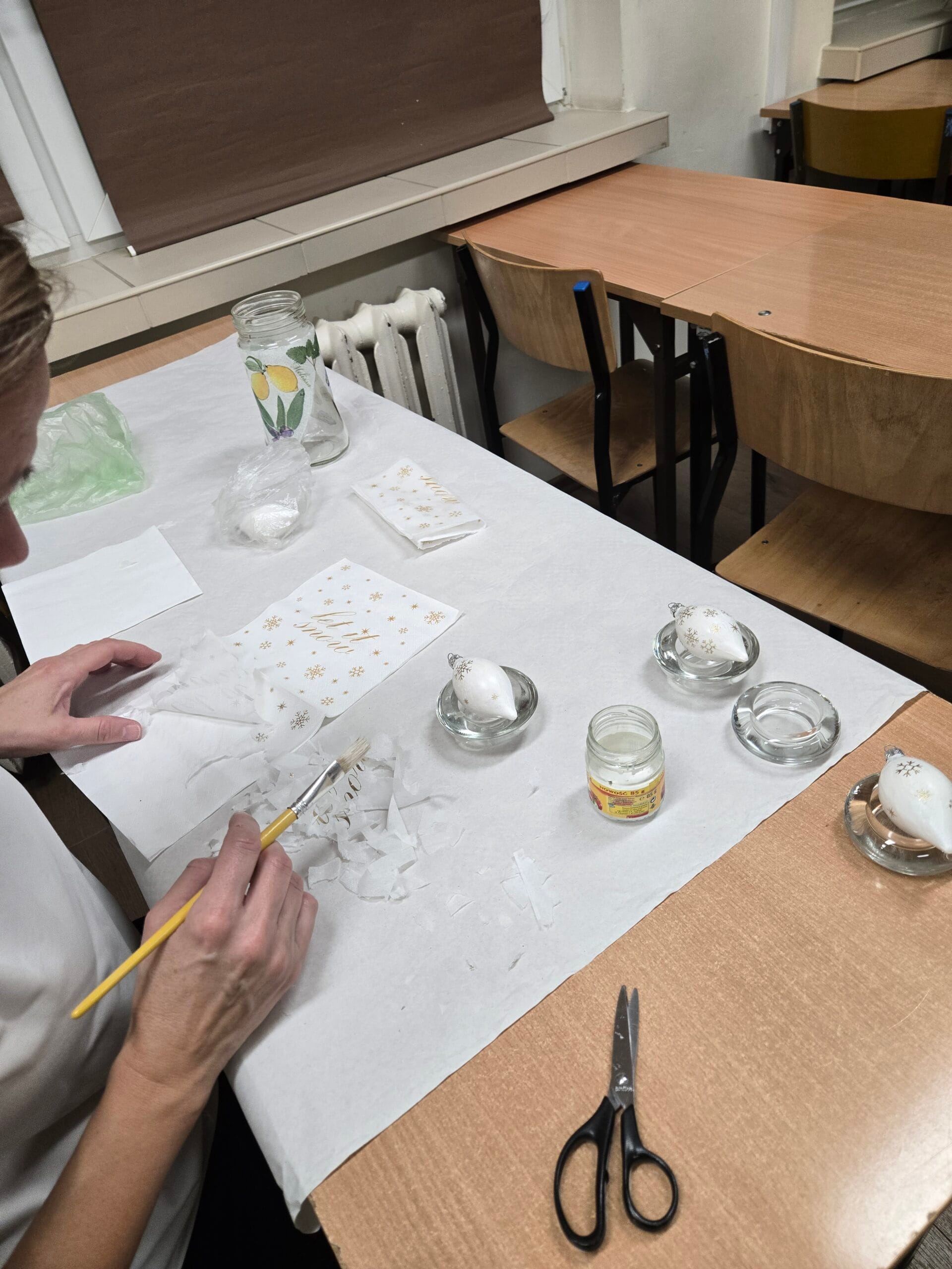Na warsztatach decoupagu również zawitały Święta Bożego Narodzenia. Uczestnicy zdobili ozdoby świąteczne oczywiście metodą decoupage relaksując się przy muzyce świątecznej. Wszyscy uczestnicy wraz z prowadzącą życzą wszystkim WESOŁYCH I ZDROWYCH ŚWIĄT!